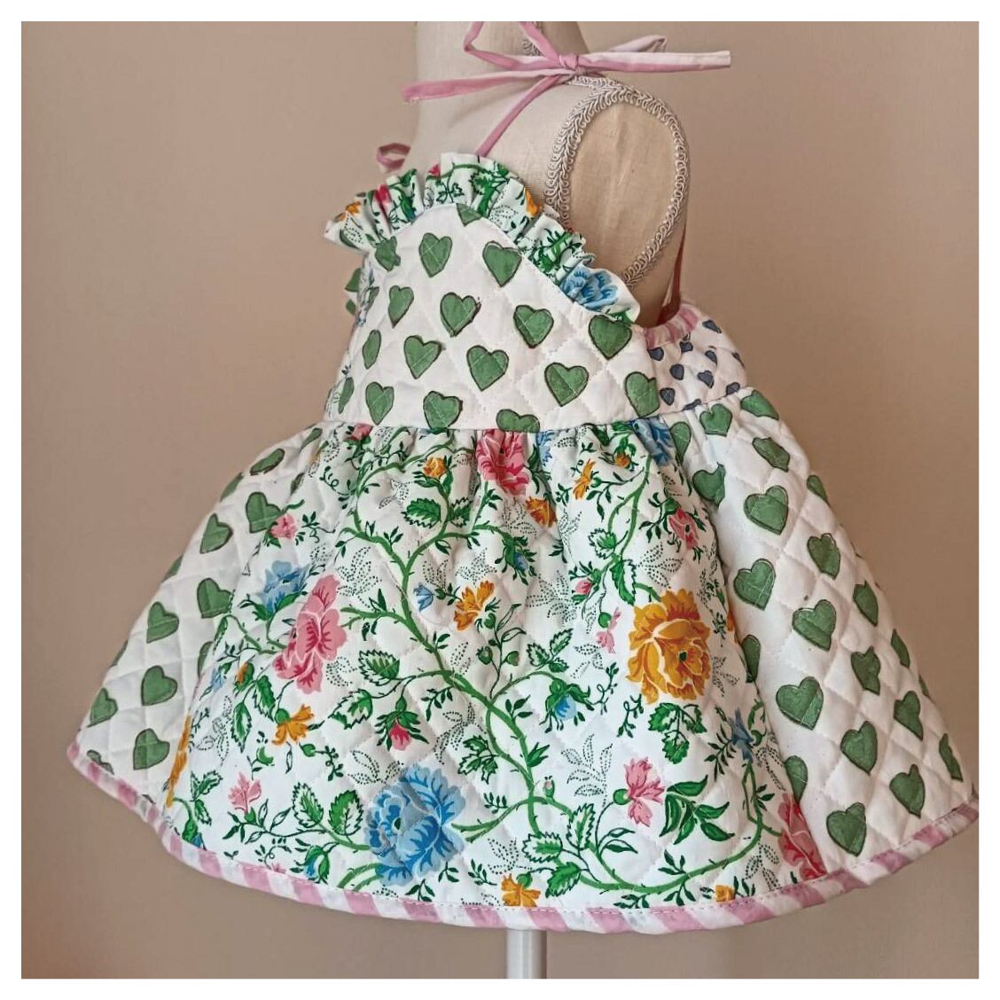 爽やかなお花がらが愛らしいアメリカのヴィンテージシーツを使用し、黄緑の大きなハートのはンドブロックプリントをブロッキング。後ろ姿にはストライプやバラのハンドブロックプリントも合わせました。