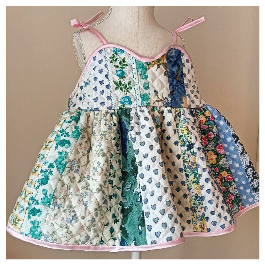 フィードサックやヴィンテージファブリック、USAコットン、ハンドブロックプリントなど、国や時代を問わず集めたお気に入り生地をつなぎ合わせてつくったビスチェ。優しいピンクサテン生地でバイアスしました。