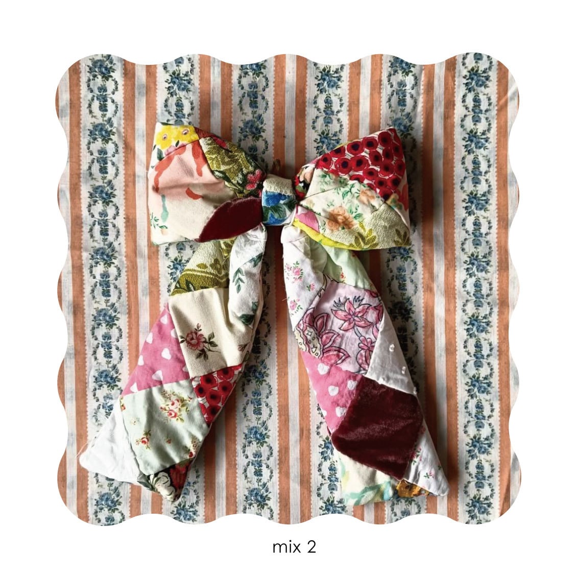 フィードサックやリバティ、USAコットン、ハンドブロックプリントなど、国や時代を問わず集めたお気に入り生地をつなぎ合わせてつくったBIGリボンです。ループが付いているので、ツリーのオーナメントとして、お誕生日のデコレーションなどにもお使いいただいています。