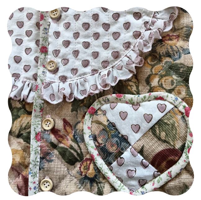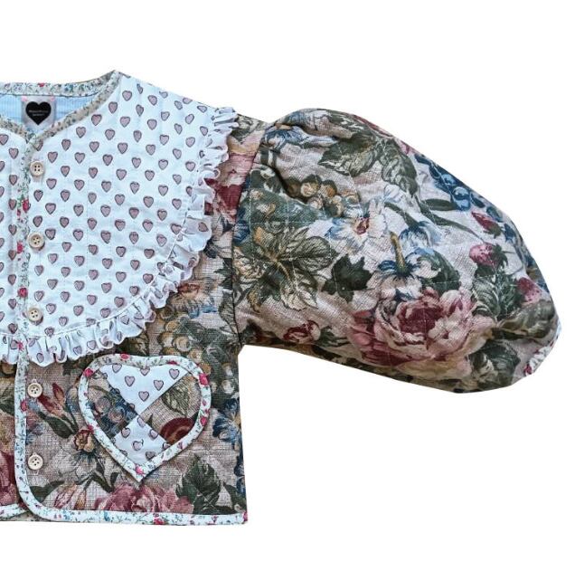 全体にバラとフルーツのざっくりとした風合いが魅力的なファブリックを使用し、フロントはくすみピンクのハンドブロックプリントをヨークを使用し、バックには家事をしているねこちゃんの刺繍がかわいいヴィンテージクロスを合わせたキルティングジャケット(Sサイズ)です。