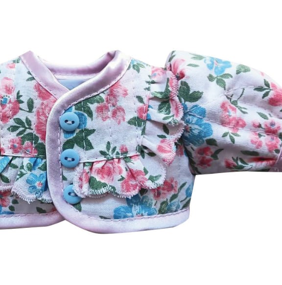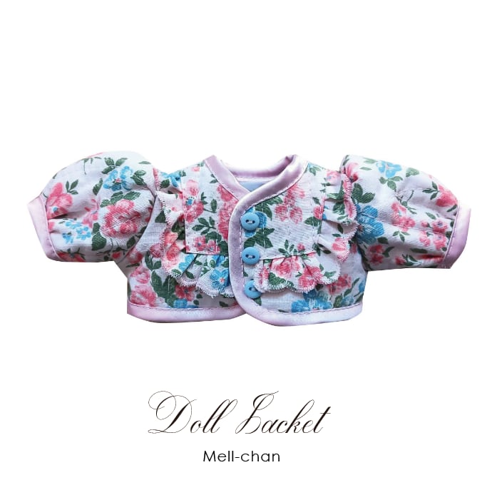 キッズのキルティングジャケットとお揃いの、お世話ドールサイズのキルティングジャケットです。ヴィンテージ生地を全体に使い、ピンクのサテン生地でバイアスしています。